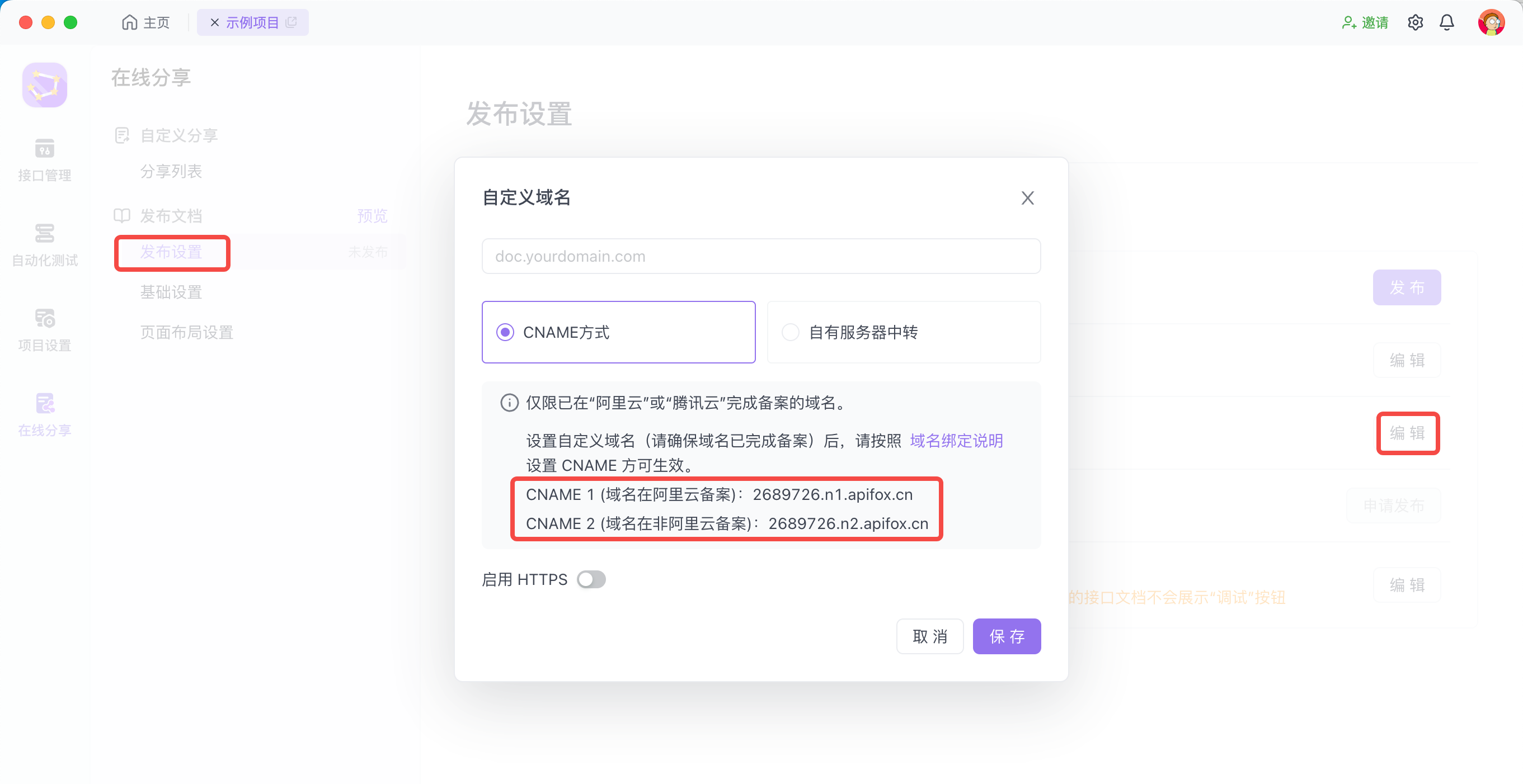 由 Apifox 生成的 API 在线文档默认使用 xx.apifox.cn 格式的 URL。如果你希望通过使用自有域名(比如:www.your-domain.com)访问 API 在线文档,那么就需要进行 CNAME 配置。