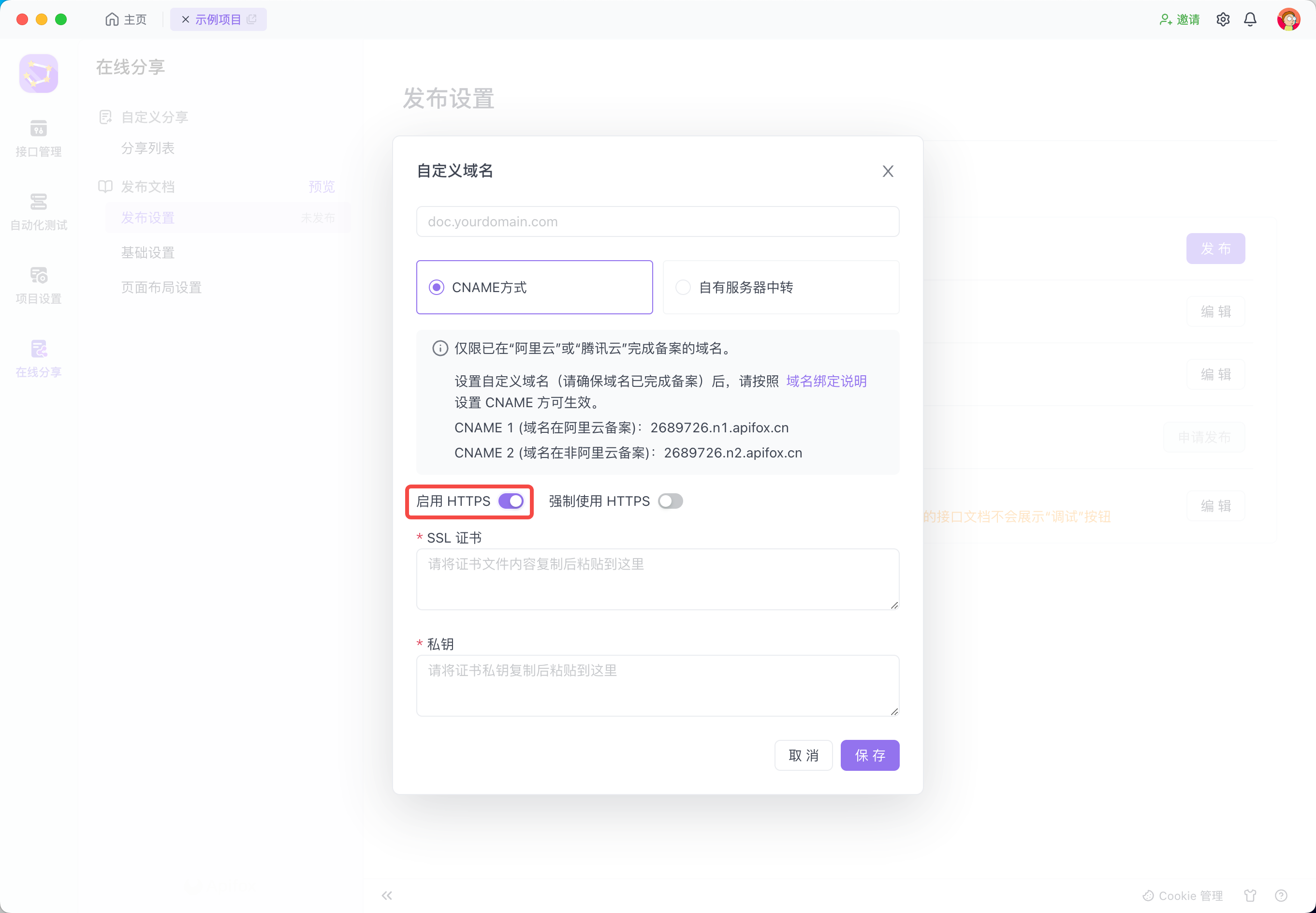 除了使用 CNAME 方式以外,Apifox 还支持使用自由服务器中转功能来实现自定义域名访问 API 在线文档。